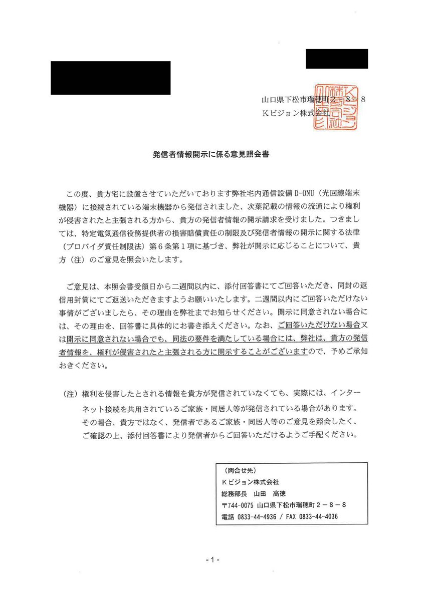 Kビジョン株式会社からの意見照会書には、「次葉記載の情報の流通による権利が侵害されたと主張される方から、貴方の発信者情報の開示請求を受けました。つきましては、特定電気通信役務提供者の損害賠償責任の制限及び発信者情報の開示に関する法律(プロバイダ責任制限法)第6条第1項に基づき、弊社が開示に応じることについて、貴方(注)のご意見を照会いたします。