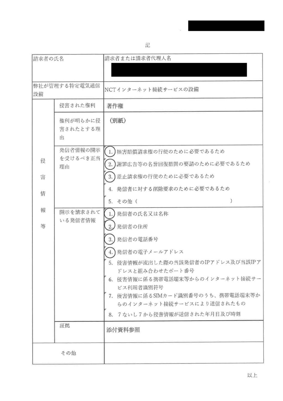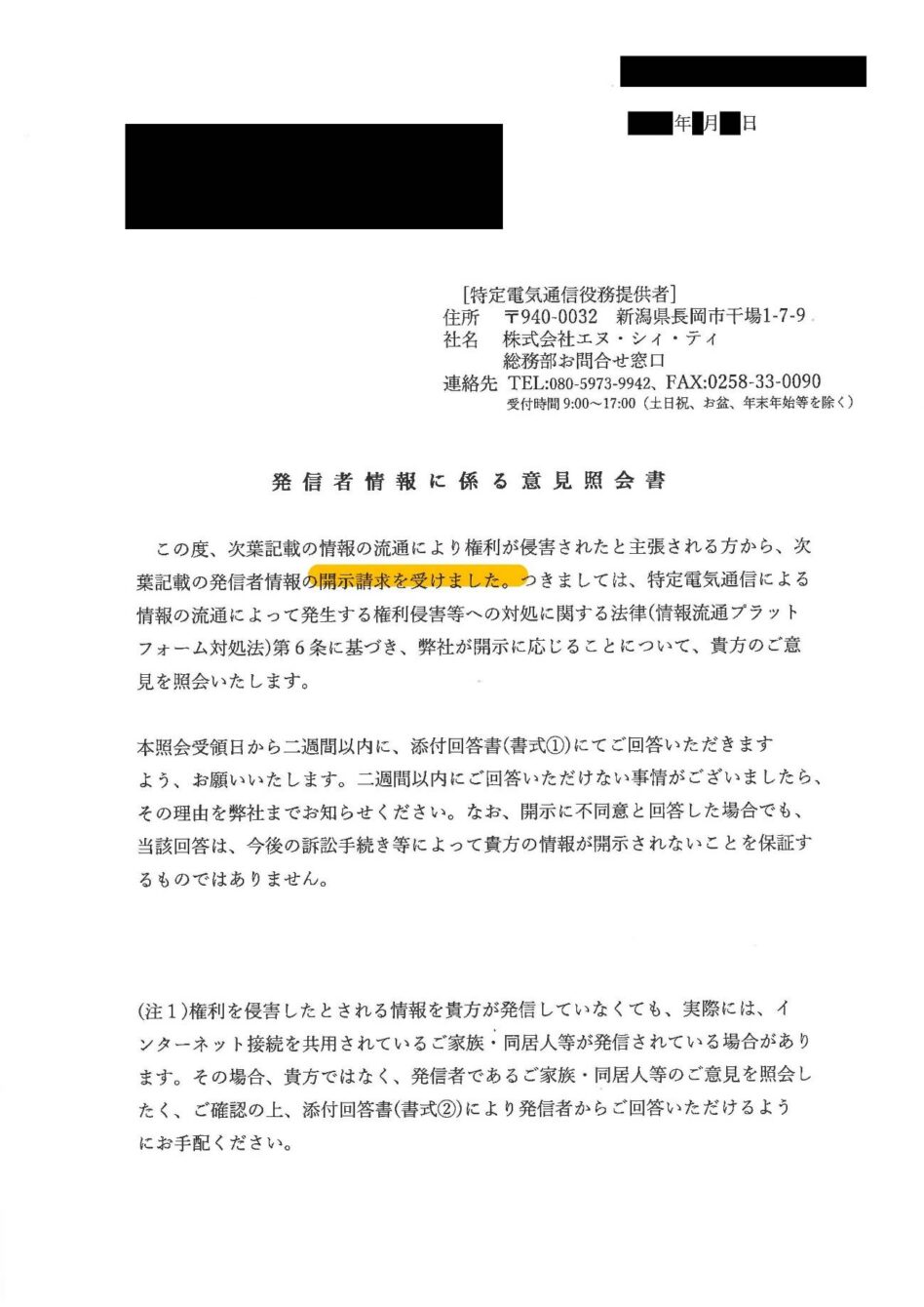 株式会社エヌ・シィ・ティからの意見照会書には、「次葉記載の情報の流通により権利が侵害されたと主張される方から、次葉記載の発信者情報の開示請求を受けました。」と記載がされており、その次のページにいわゆるテレサ式の書式による開示請求書類が添付されています。