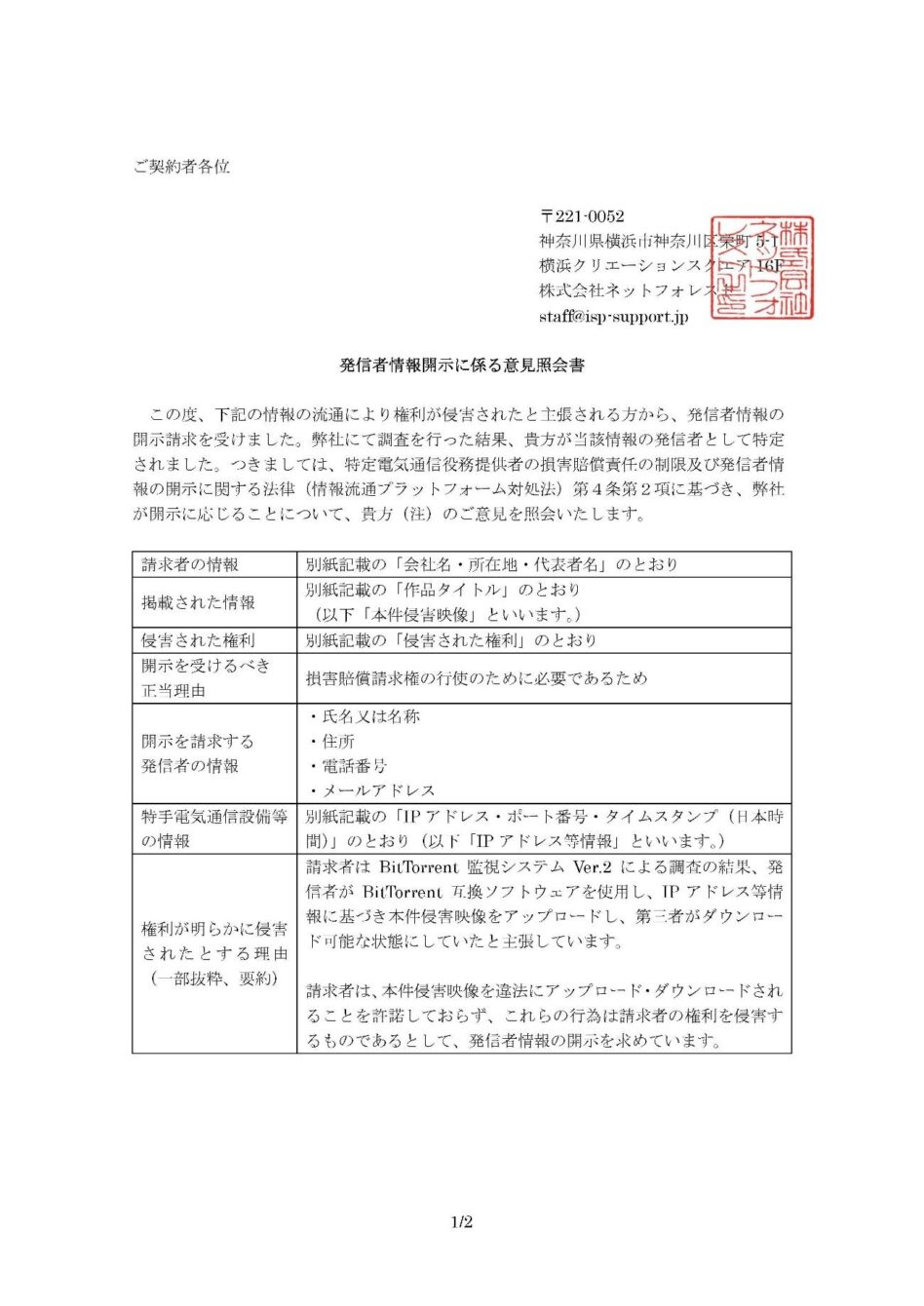 株式会社ネットフォレストからの意見照会書には、「下記の情報の流通により権利が侵害されたと主張される方から、発信者情報の