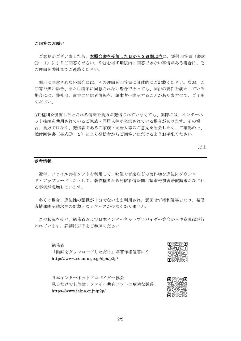 他方で、「契約者情報を開示せよとの命令を求める主旨の申立書が裁判所に提出されました。」等の記載がある場合は、発信者情報開示命令申立て手続きの方法による開示手続きが取られていることを意味しますので、ご注意ください。