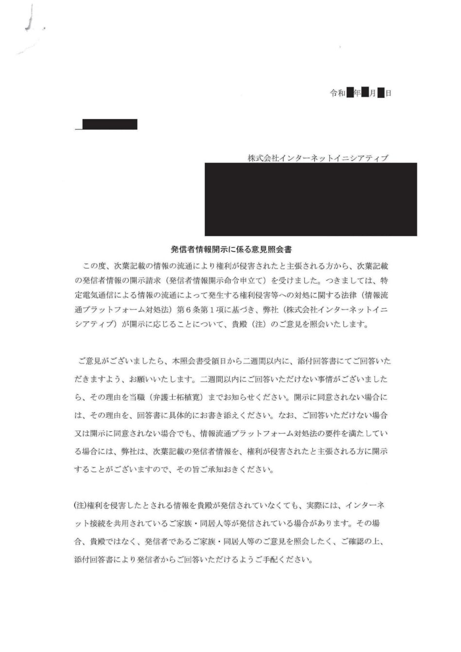 株式会社インターネットイニシアティブからの意見照会書には、「次葉記載の情報の流通により権利が侵害されたと主張される方から、次葉記載の発信者情報の開示請求(発信者情報開示命令申立て)を受けました。」と記載がされており、これはすなわち、発信者情報開示命令申立て手続きの方法による開示手続きが取られていることを意味します。