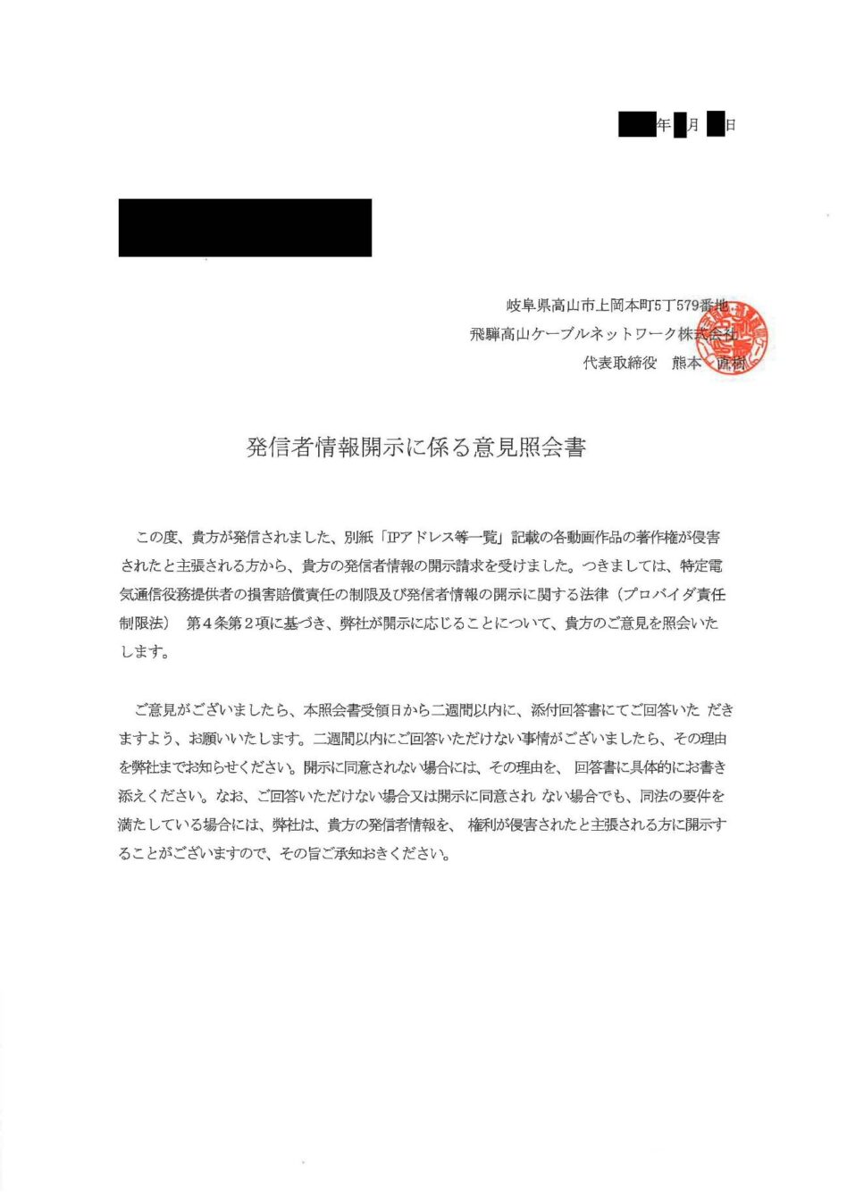 飛騨高山ケーブルネットワーク株式会社からの意見照会書には、「貴方が発信されました、別紙「IPアドレス等 覧」記載の各動画作品の著作権が侵害されたと主張される方から、貴方の発信者情報の開示請求を受けました。と記載がされており、その次のページにいわゆるテレサ式の書式による開示請求書類が添付されています。