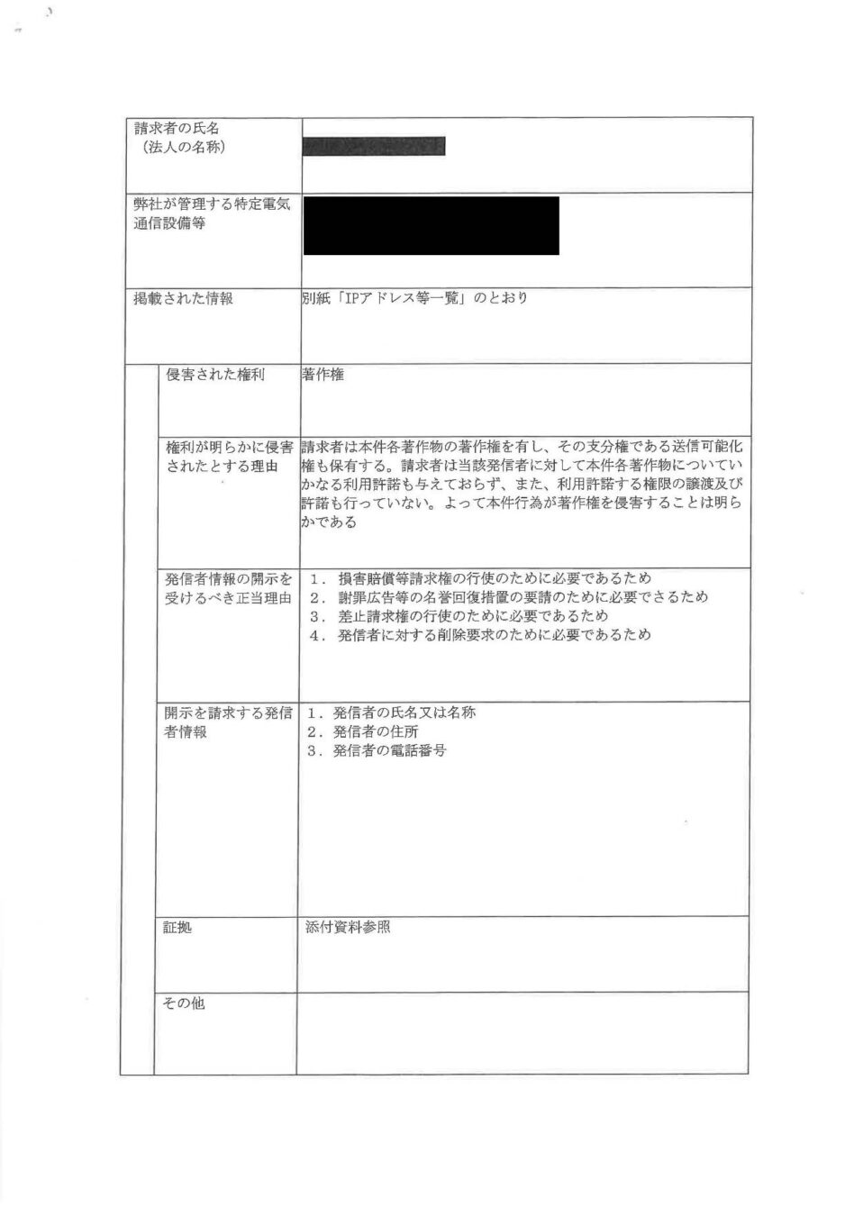 他方で、「契約者情報を開示せよとの命令を求める主旨の申立書が裁判所に提出されました。」等の記載がある場合は、発信者情報開示命令申立て手続きの方法による開示手続きが取られていることを意味しますので、ご注意ください。