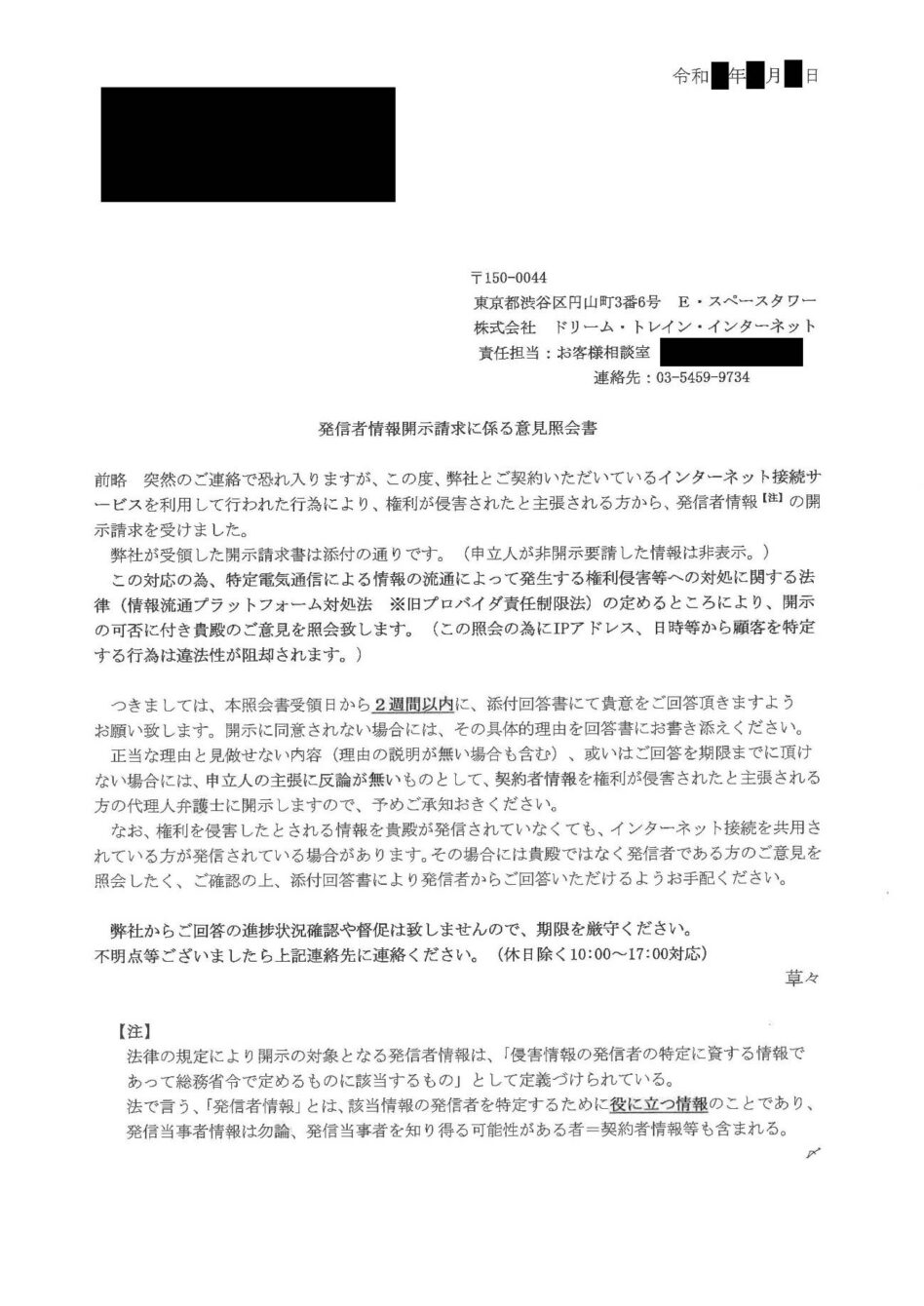 株式会社ドリーム・トレイン・インターネットからの意見照会書には、「弊社とご契約いただいているインターネット接続サービスを利用して行われた行為により、権利が侵害されたと主張される方から、発信者情報【注]の開示請求を受けました。」と記載がされており、その次のページにいわゆるテレサ式の書式による開示請求書類が添付されています。