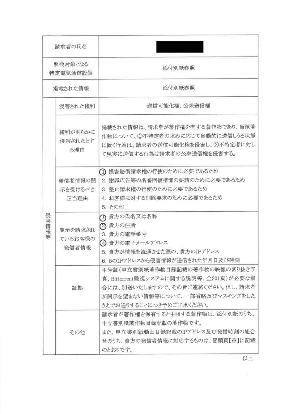 「次葉記載の情報の流通により 権利が侵害されたと主張される方から、次葉記載の発信者情報の開示請求を受けました。」