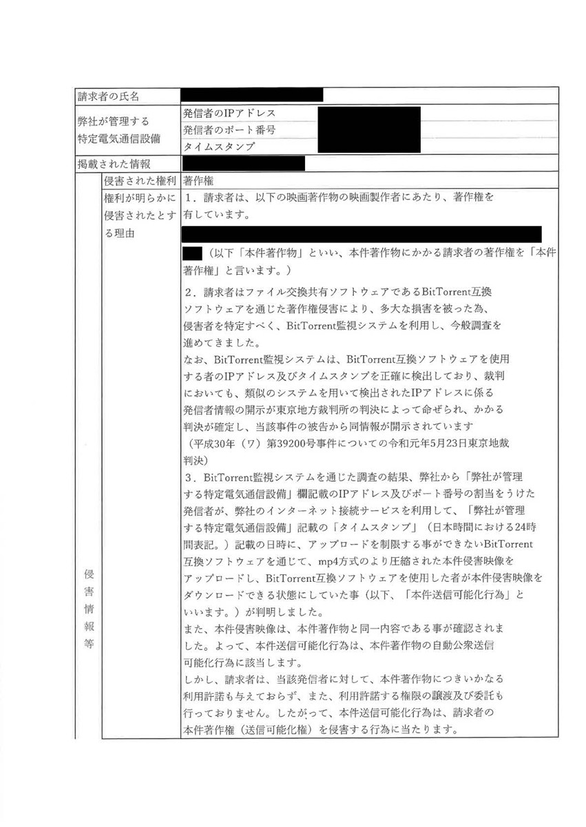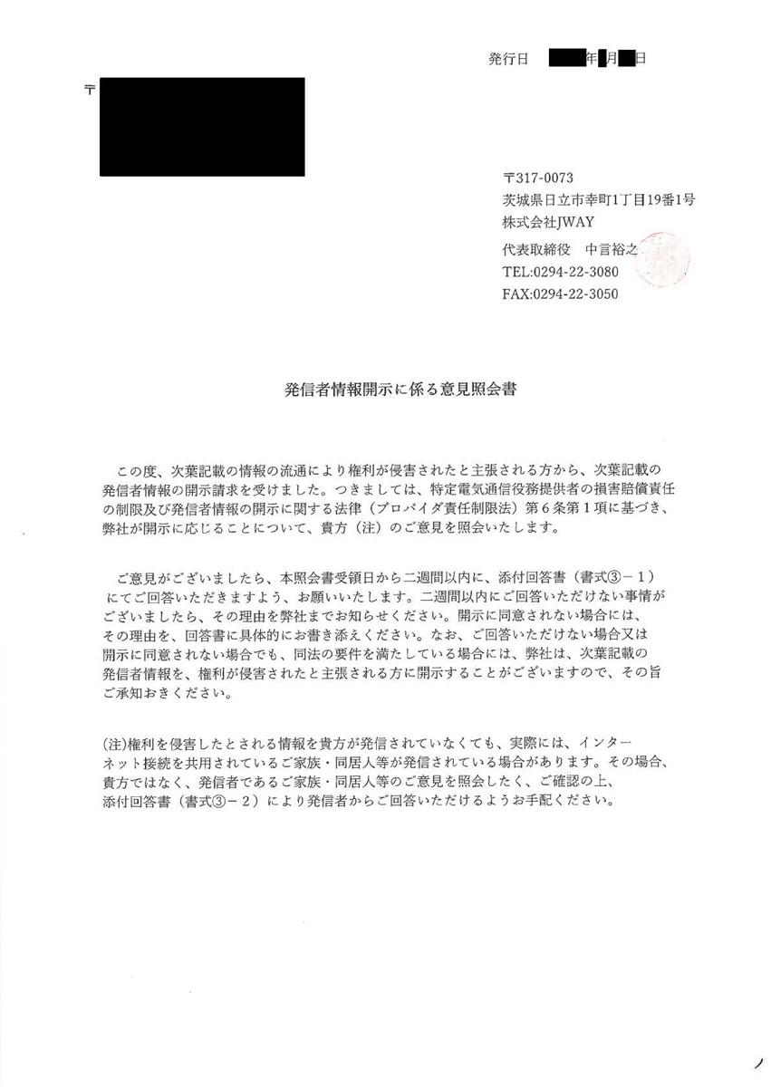JWAYからの意見照会書には、「次葉記載の情報の流通により権利が侵害されたと主張される方から、次葉記載の発信者情報の開示請求を受け付けました。」と記載がされており、次のページにいわゆるテレサ式の書式による開示請求申立書が添付されています。