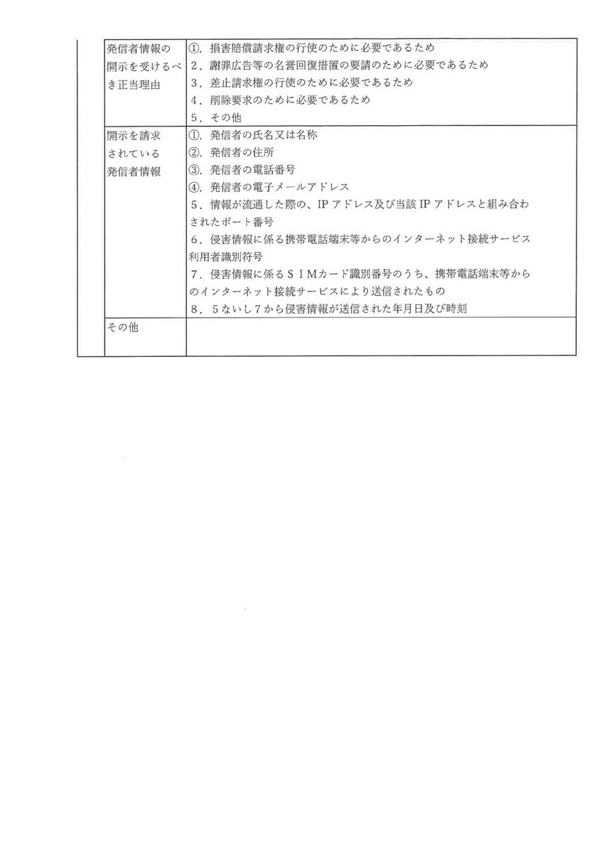 他方で、「契約者情報を開示せよとの命令を求める主旨の申立書が裁判所に提出されました。」等の記載がある場合は、発信者情報開示命令申立て手続きの方法による開示手続きが取られていることを意味しますので、ご注意ください。