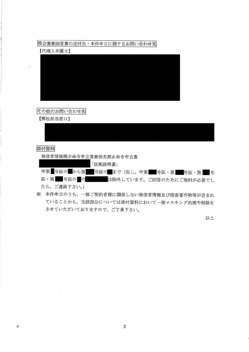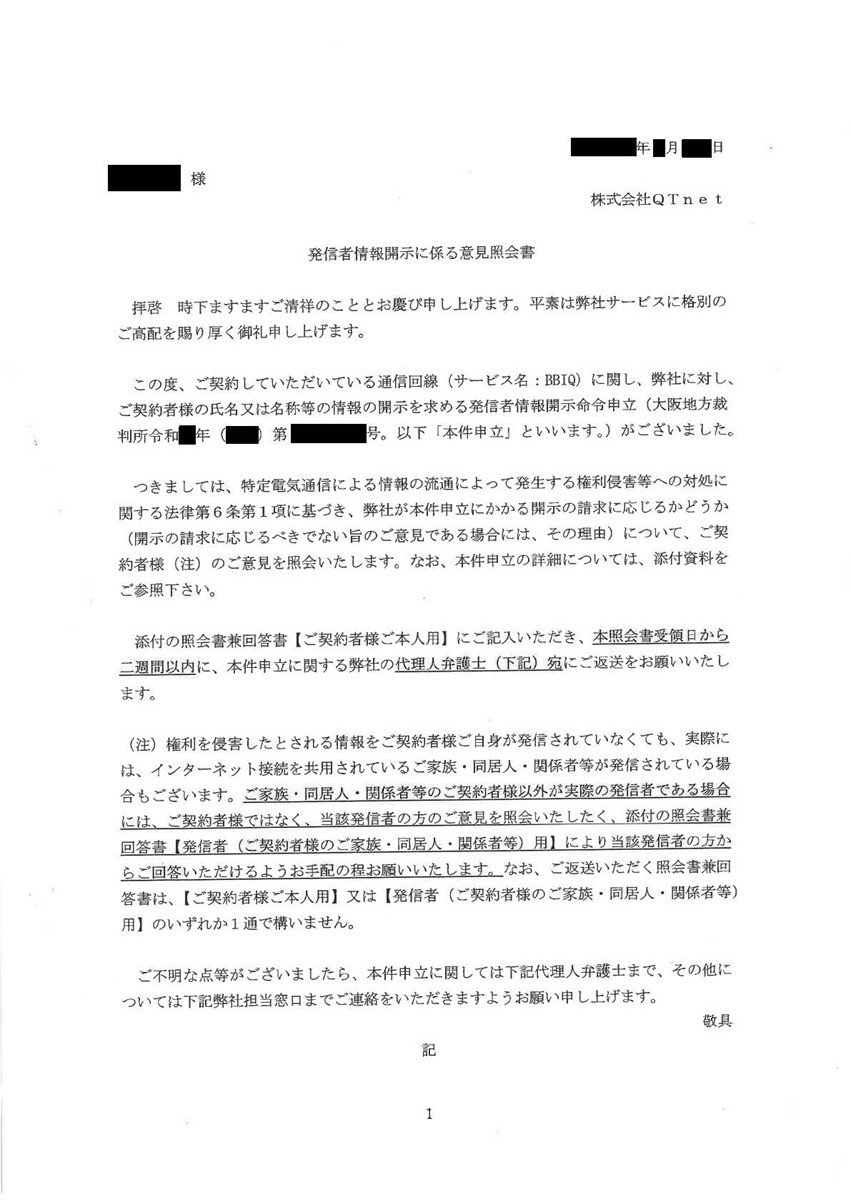 株式会社QTnetからの意見照会書には、「この度、ご契約していただいている通信回線(サービス名:BBIQ)に関し、弊社に対し、ご契約者様の氏名又は名称等の情報の開示を求める発信者情報開示命令申立がございました。」と記載がされており、これはすなわち、発信者情報開示命令申立て手続きの方法による開示手続きが取られていることを意味します。