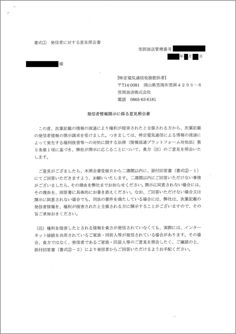 笠岡放送株式会社からの意見照会書には、「次葉記載の情報の流通により権利が侵害されたと主張される方から、 次葉記載の発信者情報の開示請求を受けました。」と記載がされており、その次のページに開示請求書類が添付されています。