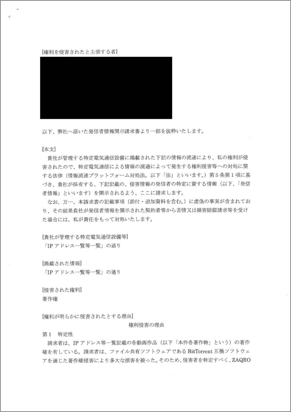 その内容を見ると、アダルトビデオをトレントで利用したとして開示請求がされていると書いてある。