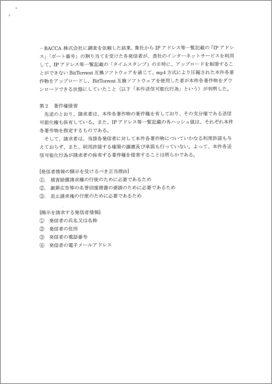 近年、BitTorrentシステム(以下「トレント」)の利用に伴う著作権侵害を理由としたプロバイダーからの意見照会書が郵便やメールで届き、また、その後の製作会社からの通知に関するご相談が急増しています。また、期間を空けて複数社からまばらに開...
