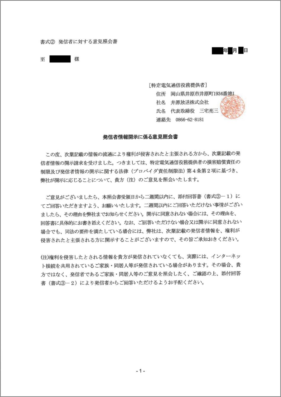 井原放送株式会社からの意見照会書には、「次葉記載の情報の流通により権利が侵害されたと主張される方から、 次葉記載の発信者情報の開示請求を受けました。」と記載がされており、その次のページにいわゆるテレサ式の書式による開示請求書類が添付されています。