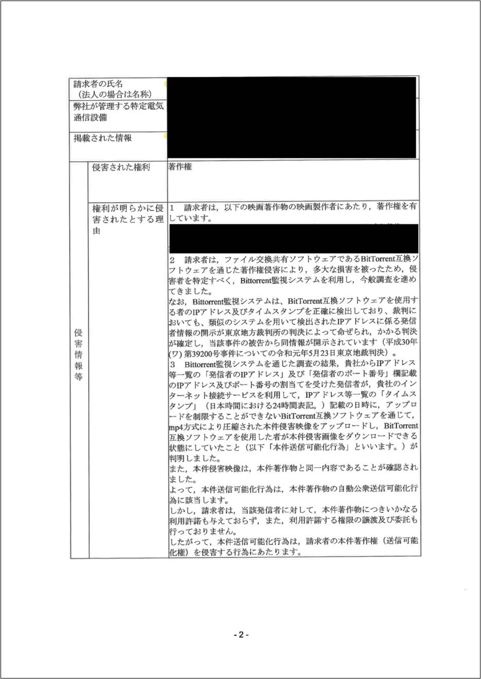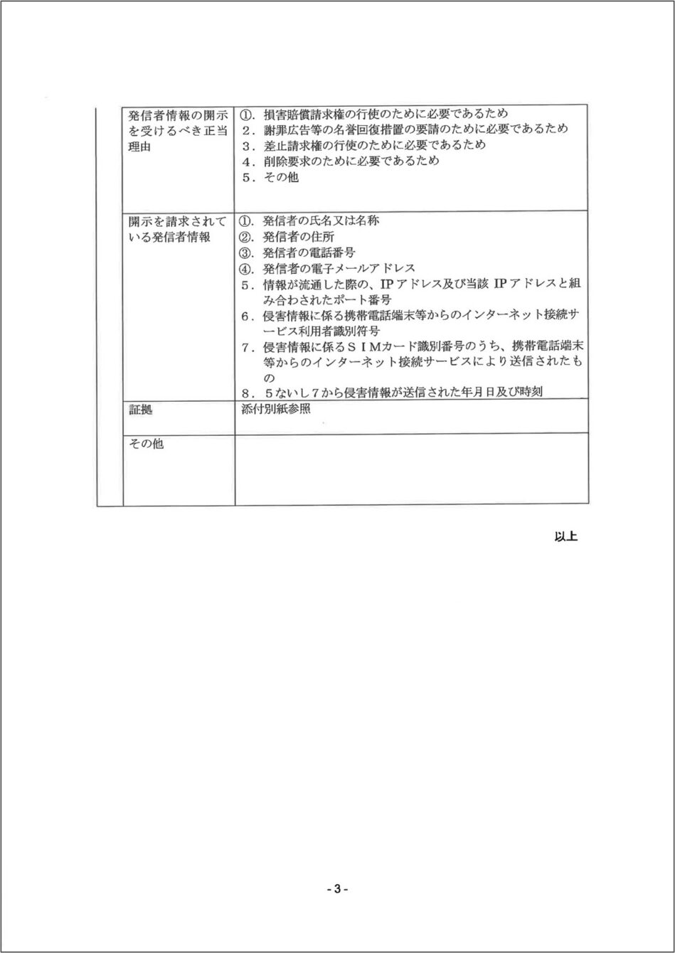 他方で、「契約者情報を開示せよとの命令を求める主旨の申立書が裁判所に提出されました。」等の記載がある場合は、発信者情報開示命令申立て手続きの方法による開示手続きが取られていることを意味しますので、ご注意ください。