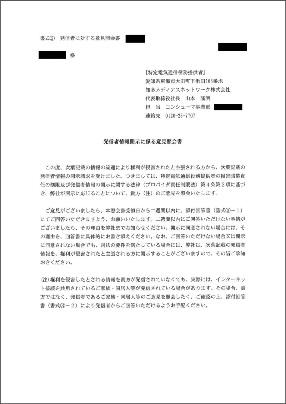 知多メディアスネットワーク株式会社からの意見照会書には、「次葉記載の情報の流通により権利が侵害されたと主張される方から、 次葉記載の発信者情報の開示請求を受けました。」と記載がされており、その次のページにいわゆるテレサ式の書式による開示請求書類が添付されています。