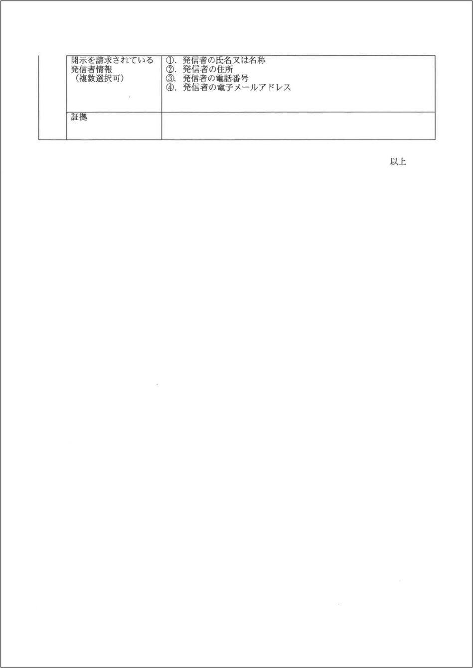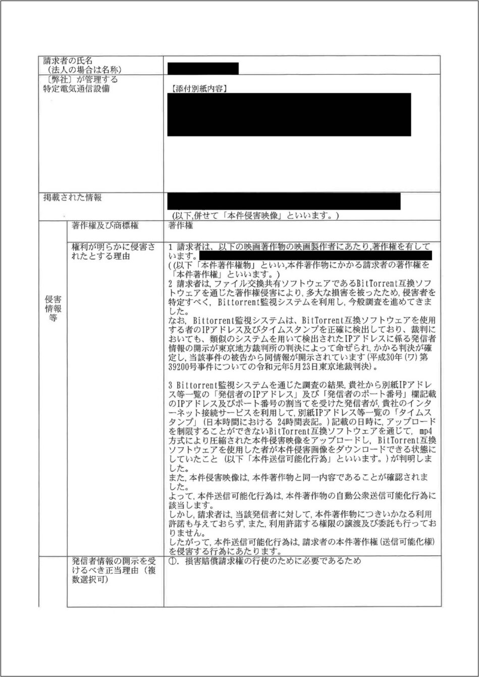 他方で、「契約者情報を開示せよとの命令を求める主旨の申立書が裁判所に提出されました。」等の記載がある場合は、発信者情報開示命令申立て手続きの方法による開示手続きが取られていることを意味しますので、ご注意ください。