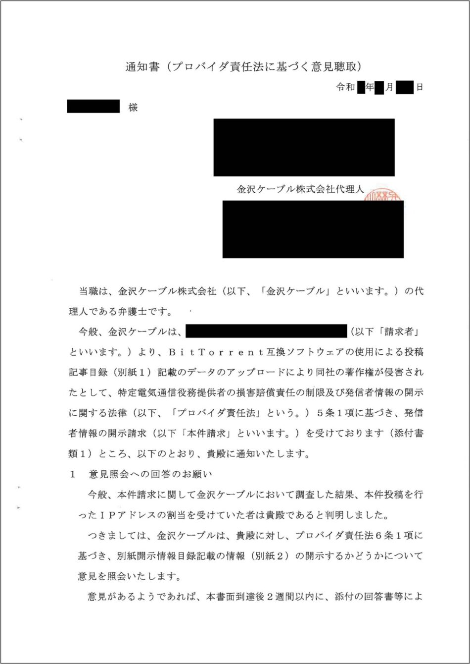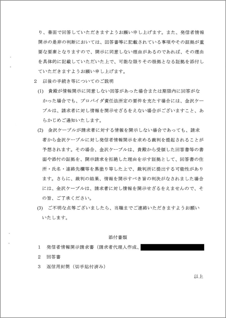 金沢ケーブル株式会社からの意見照会書には、「発信者情報の開示請求を受けておりますところ、以下のとおり、貴殿に通知いたします。」と記載がされており、いわゆるテレサ式の書式による開示請求書類が添付されています。
