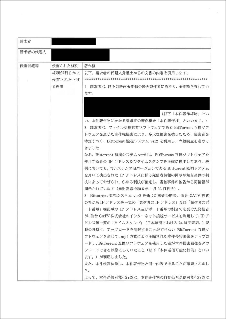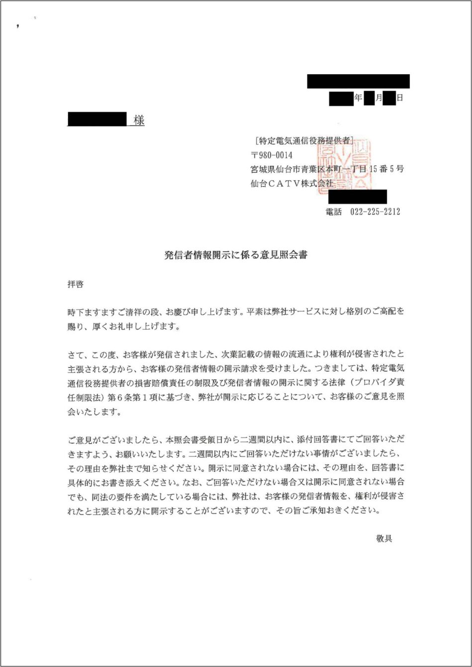 仙台CATV株式会社からの意見照会書には、「お客様が発信されました、次葉記載の情報の流通により権利が侵害されたと主張される方から、お客様の発信者情報の開示請求を受けました。」と記載がされており、その次のページにいわゆるテレサ式の書式による開示請求書類が添付されています。