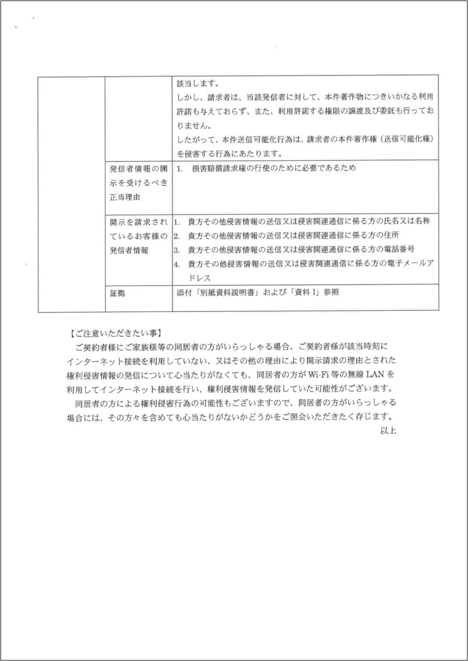 他方で、「契約者情報を開示せよとの命令を求める主旨の申立書が裁判所に提出されました。」等の記載がある場合は、発信者情報開示命令申立て手続きの方法による開示手続きが取られていることを意味しますので、ご注意ください。