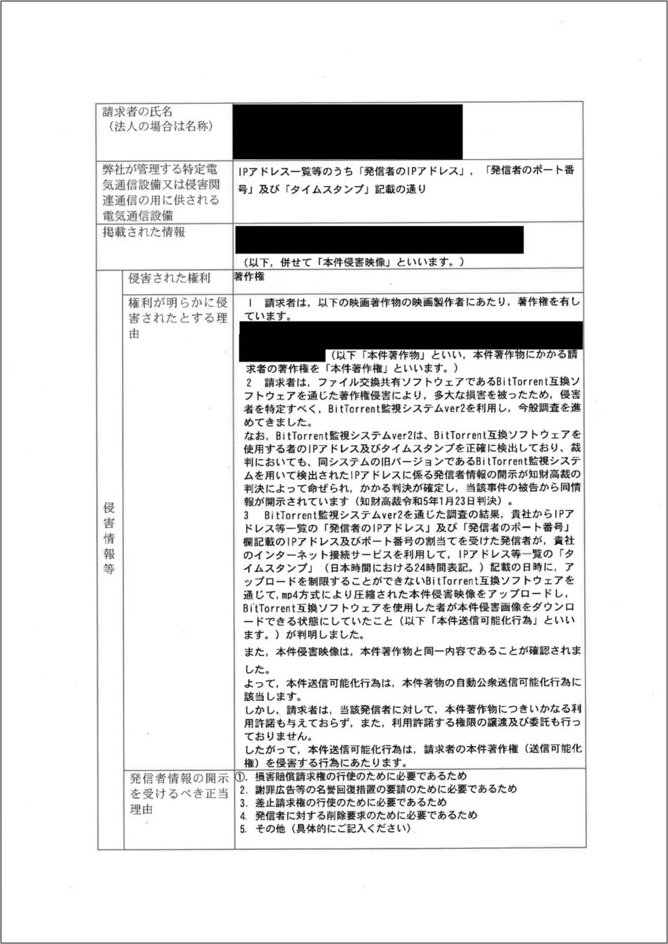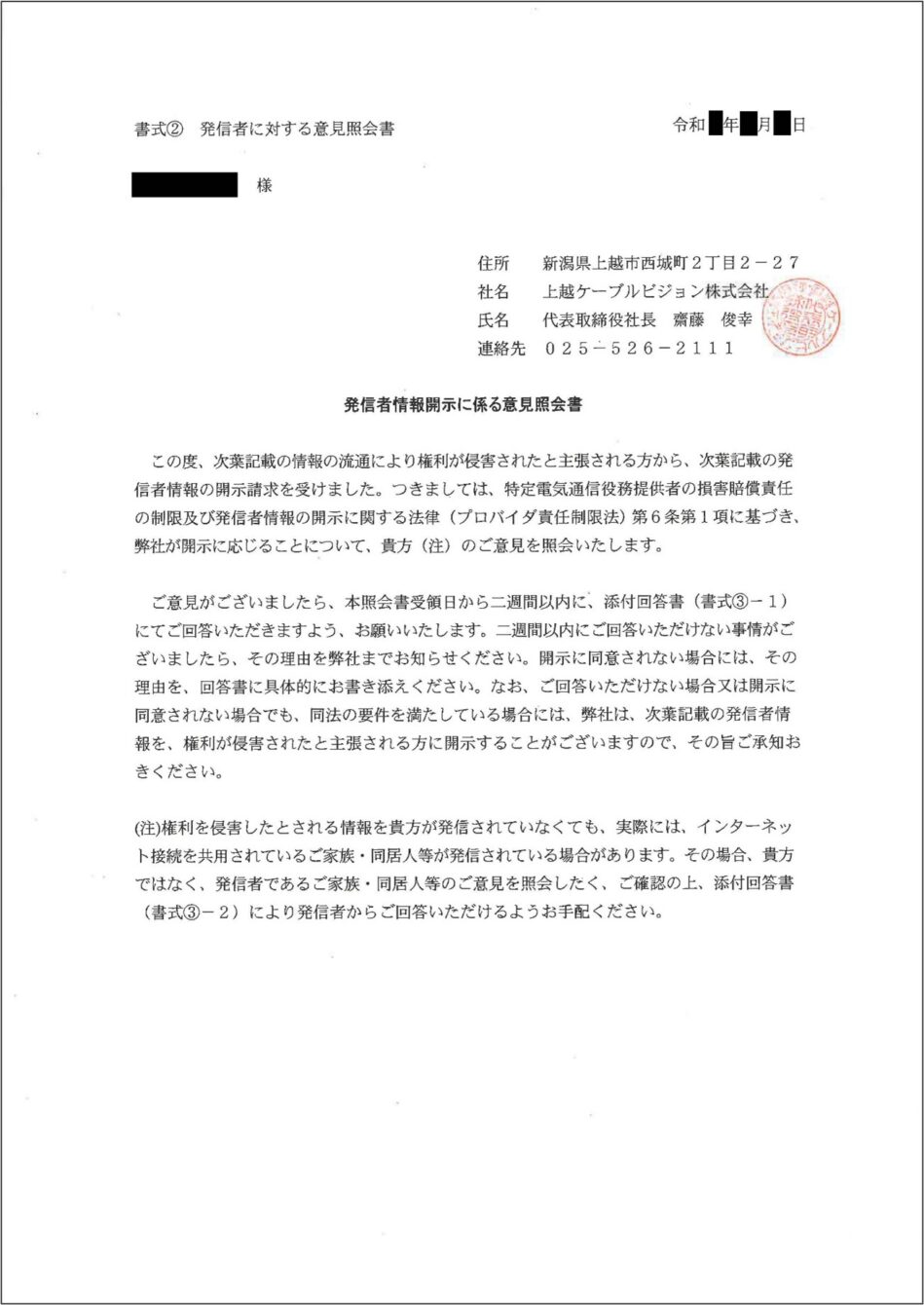 上越ケーブルビジョン株式会社からの意見照会書には、「次葉記載の情報の流通により権利が侵害されたと主張される方から、 次葉記載の発信者情報の開示請求を受けました。」と記載がされており、その次のページにいわゆるテレサ式の書式による開示請求書類が添付されています。