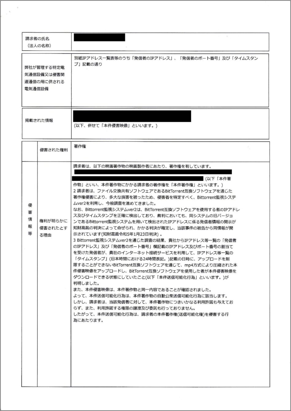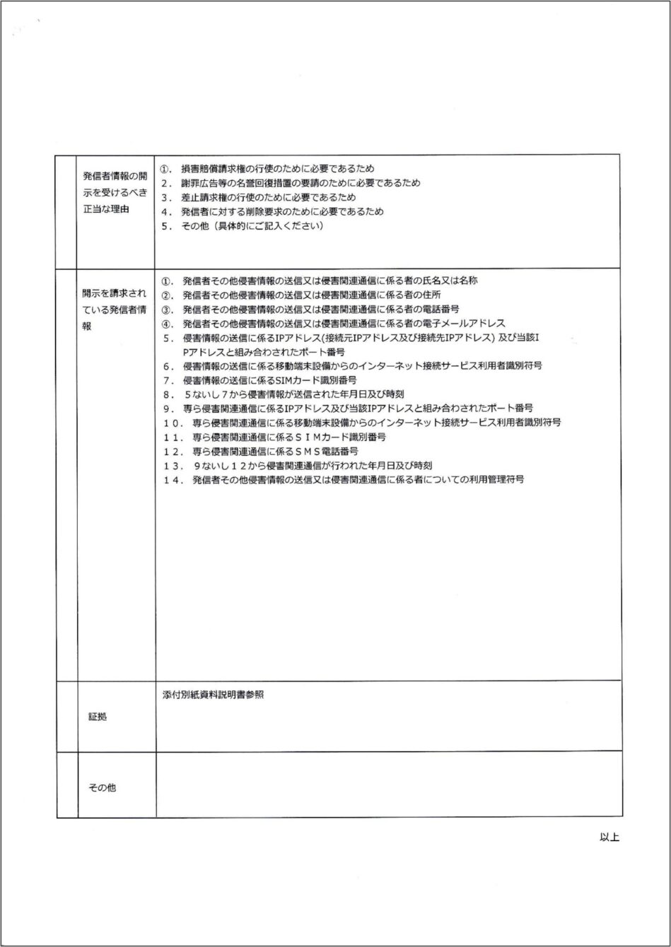 他方で、「契約者情報を開示せよとの命令を求める主旨の申立書が裁判所に提出されました。」等の記載がある場合は、発信者情報開示命令申立て手続きの方法による開示手続きが取られていることを意味しますので、ご注意ください。