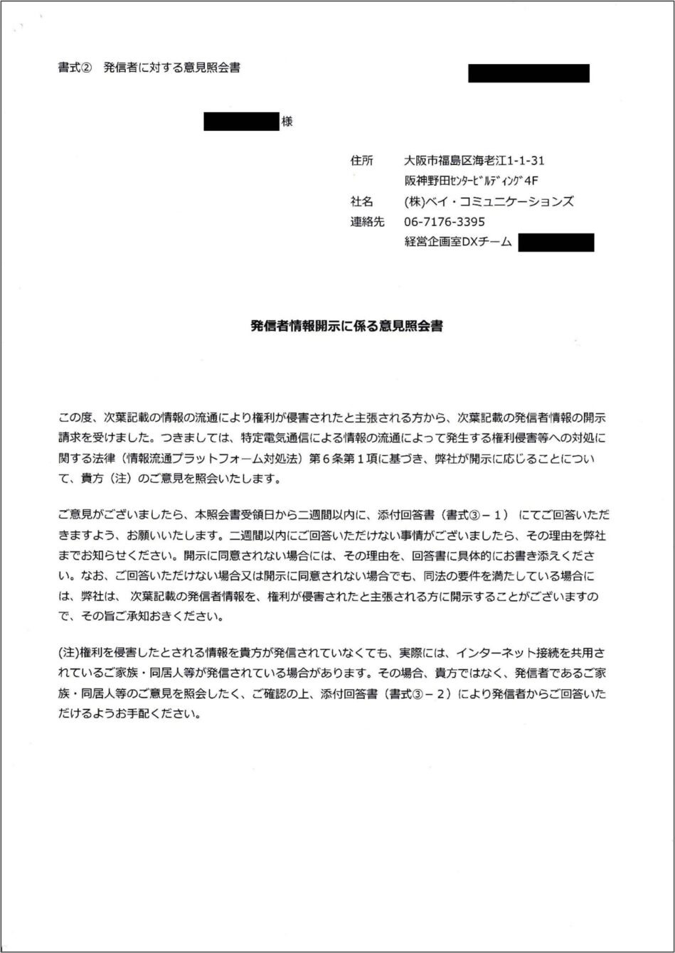 株式会社ベイ・コミュニケーションズからの意見照会書には、「次葉記載の情報の流通により権利が侵害されたと主張される方から、次葉記載の発信者情報の開示請求を受けました。」と記載がされており、その次のページにいわゆるテレサ式の書式による開示請求書類が添付されています。